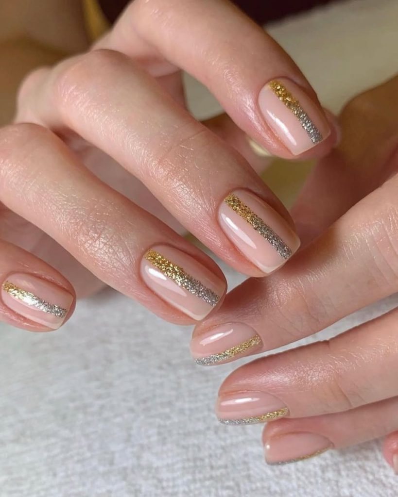 Understated and office-friendly with just enough sparkle for cocktails: short nude squares traced with ultra-thin Gold and silver glitter bands. The effect is Minimal, quietly luxurious, and incredibly easy to maintain—perfect for travel-heavy Decembers. This is also a smart choice if you prefer acrylic short overlays but want a breathable, natural look.