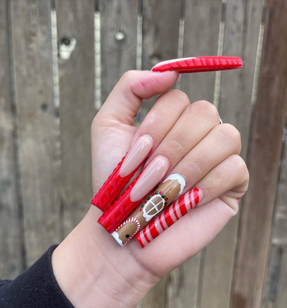 Long sculpted squares balance three ideas: a plush knit panel in high-gloss Red, a gingerbread-house accent framed in snowy White, and a diagonal peppermint candy cane stripe. The negative-space nudes on the remaining nails keep the artwork elevated rather than busy. If you’re hosting, this is festive without tipping into kitsch — the crisp blocking keeps it Classy.