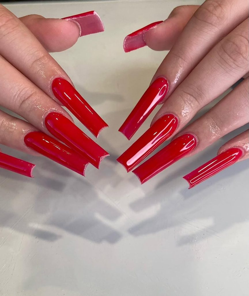 A power set that proves less can be more: mirror-shine long red squares in a blue-leaning cherry tone. High arch, razor-straight sidewalls, and a glassy seal read runway-ready and endlessly photogenic for dinners, concerts, and office parties.