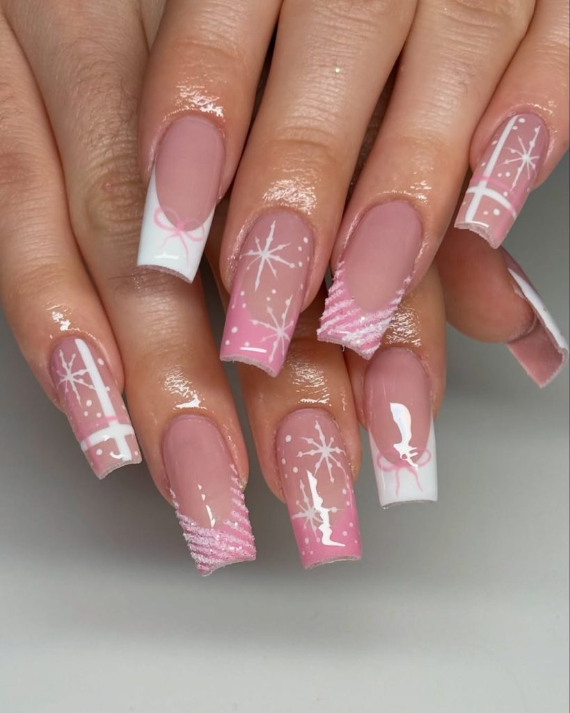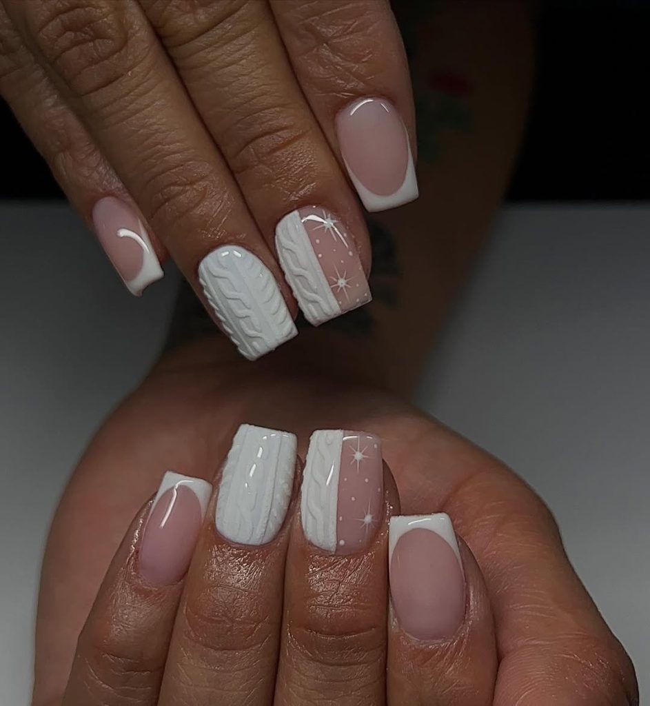 A sheer nude base meets soft-Pink tips, sugar-textured cable accents, delicate White bows, and starry snowbursts. It reads sweet and Classy—perfect for office festivities that flow into dinner reservations.Why it works: A single textured nail per hand adds depth without clutter; the square shape keeps it polished.