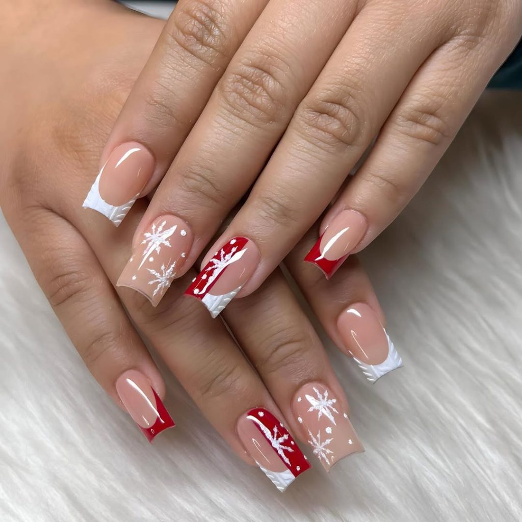 Alternating French tips in holiday Red and crisp White with sculpted snowy ridges and scattered snowflakes. Short-to-Medium squares make it everyday-wearable while still reading celebratory. The alternating palette flatters neutral outfits and pops beautifully against black wool.