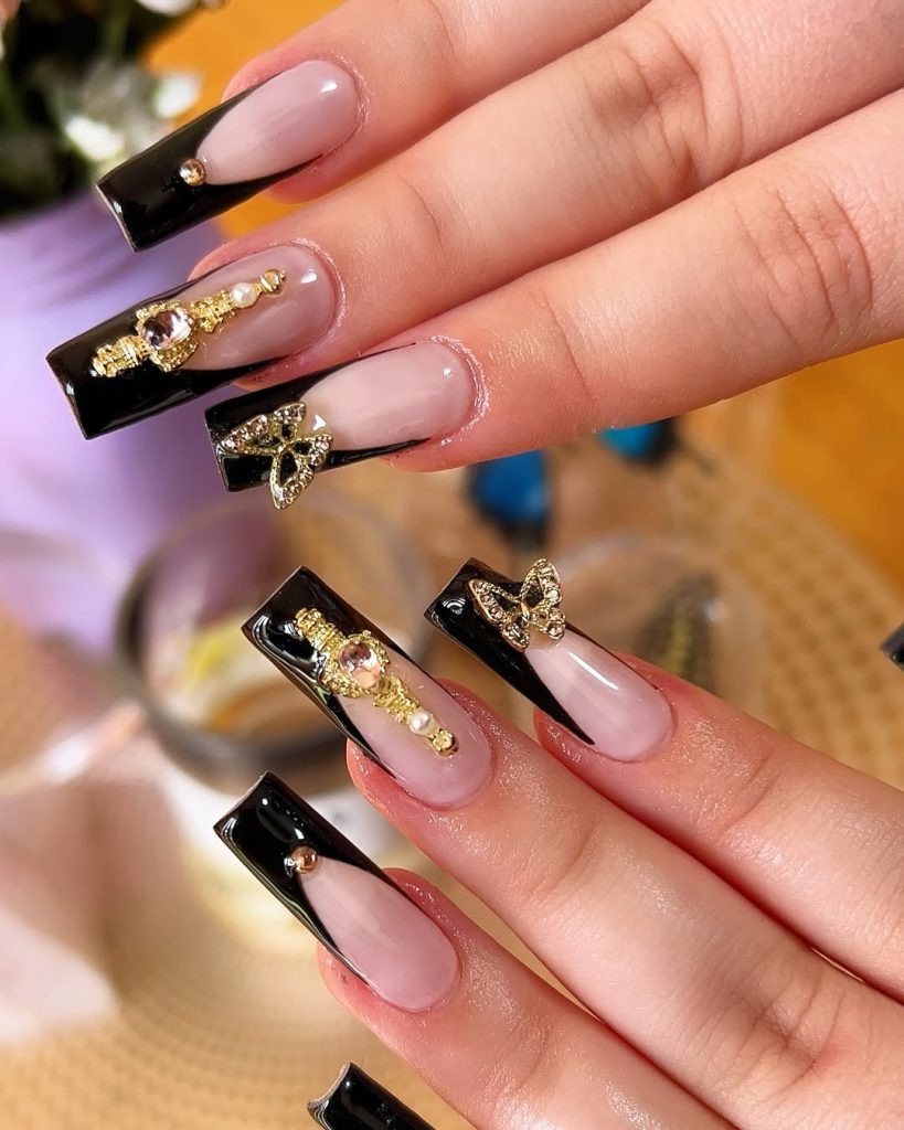 High-gloss noir tips meet negative-space nudes, then get dressed up with jewel-toned charms and gilded bows. The long, crisp square silhouette keeps the opulence grounded and unmistakably Classy. Think New Year’s Eve at a downtown cocktail bar or a velvet blazer moment.Why it works: Black edges slenderize the nail; the vertical gem placement elongates the finger.