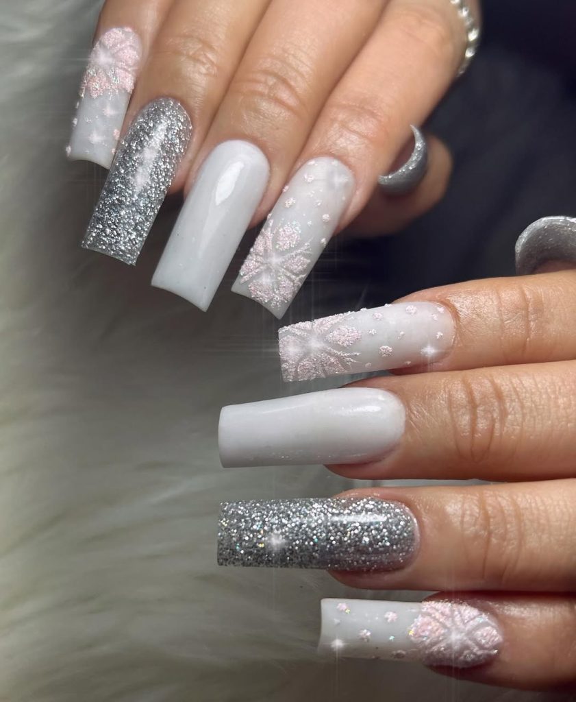 A cool milk-White base alternates with full-saturation silver glitter and sugar-dusted snowflake panels. It feels crisp, wintry, and quietly luxe—the manicure version of a cashmere scarf.Why it works: Mixed finishes (gloss, sugar, foil shimmer) create depth without color overload.