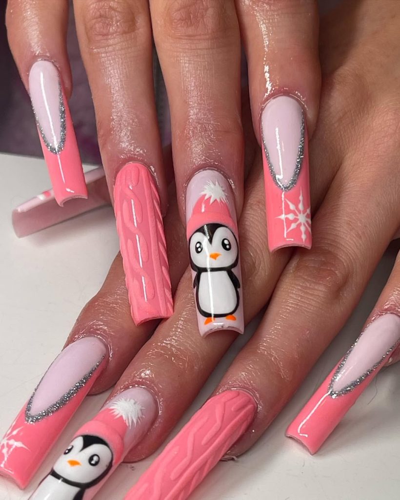 Candy-Pink tips with knit embossing meet silver-edged deep smiles, while a cozy-hat penguin brings personality. The long square keeps the look graphic, not juvenile—great for moms balancing school concerts and dressy dinners.Why it works: One animated accent per hand; everything else supports the palette with texture.