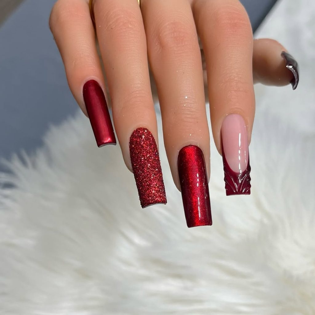 This is “evening-lighting” perfection: Dark red metallic that reads like velvet, a dense ruby glitter accent, and a sculpted knit-French on a nude base. Long squares feel dramatic yet still tailored.Why it works: A single texture nail amplifies richness without visual clutter.