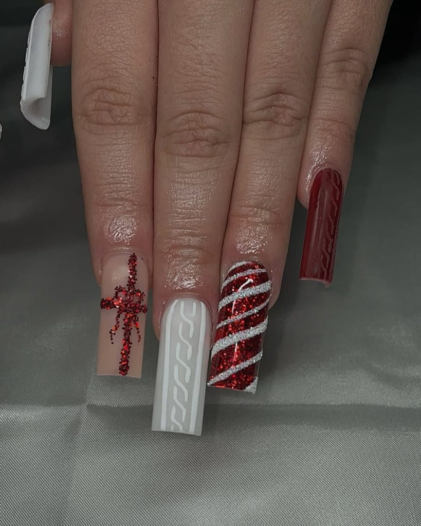 A nude gift-wrap cross in ruby glitter, snow-White knit embossing, and a diagonal candy cane sparkle stripe—anchored by a rich glossy Red. The straight square edges keep the playful elements sophisticated.Why it works: Three motifs, one palette; the negative space saves it from feeling heavy.