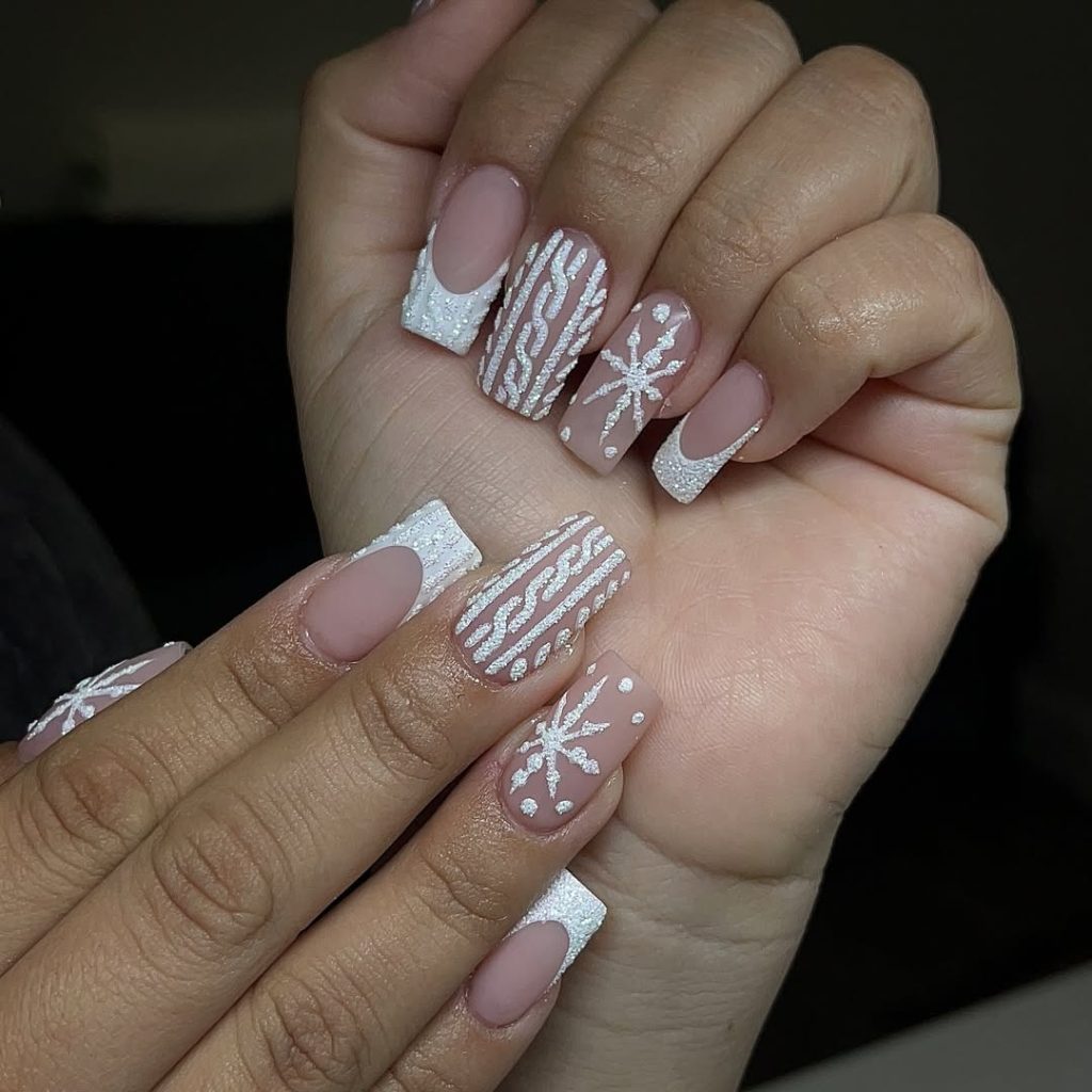 A soft nude base lets frosted cable-knit lines and starry flakes in crisp White do the talking. The short, tidy square reads Minimal and Subtle, but the sugar-dusted glitter texture keeps it festive for Winter brunches or office photos.
