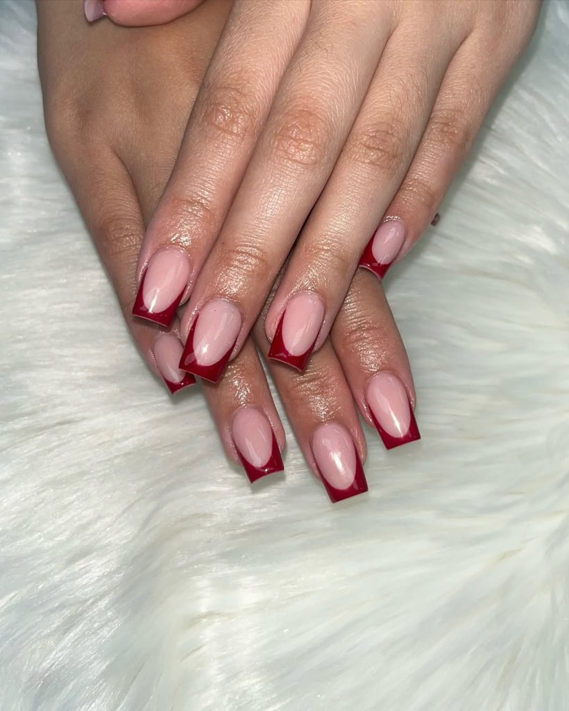 A sheer pink-nude paired with razor-clean micro tips in glossy Red. The Medium square silhouette is polished and Classy, giving that “holiday lip, minimal nail” energy that never dates.