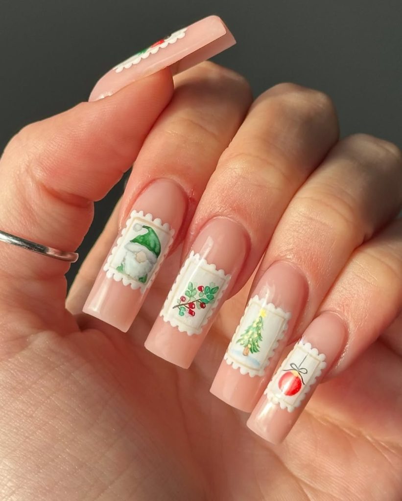 Tiny hand-painted “stamps”—holly, a tree, an ornament, and a little gnome—sit inside scalloped frames on a neutral base. It’s playful yet neat, like sending season’s greetings from your manicure.