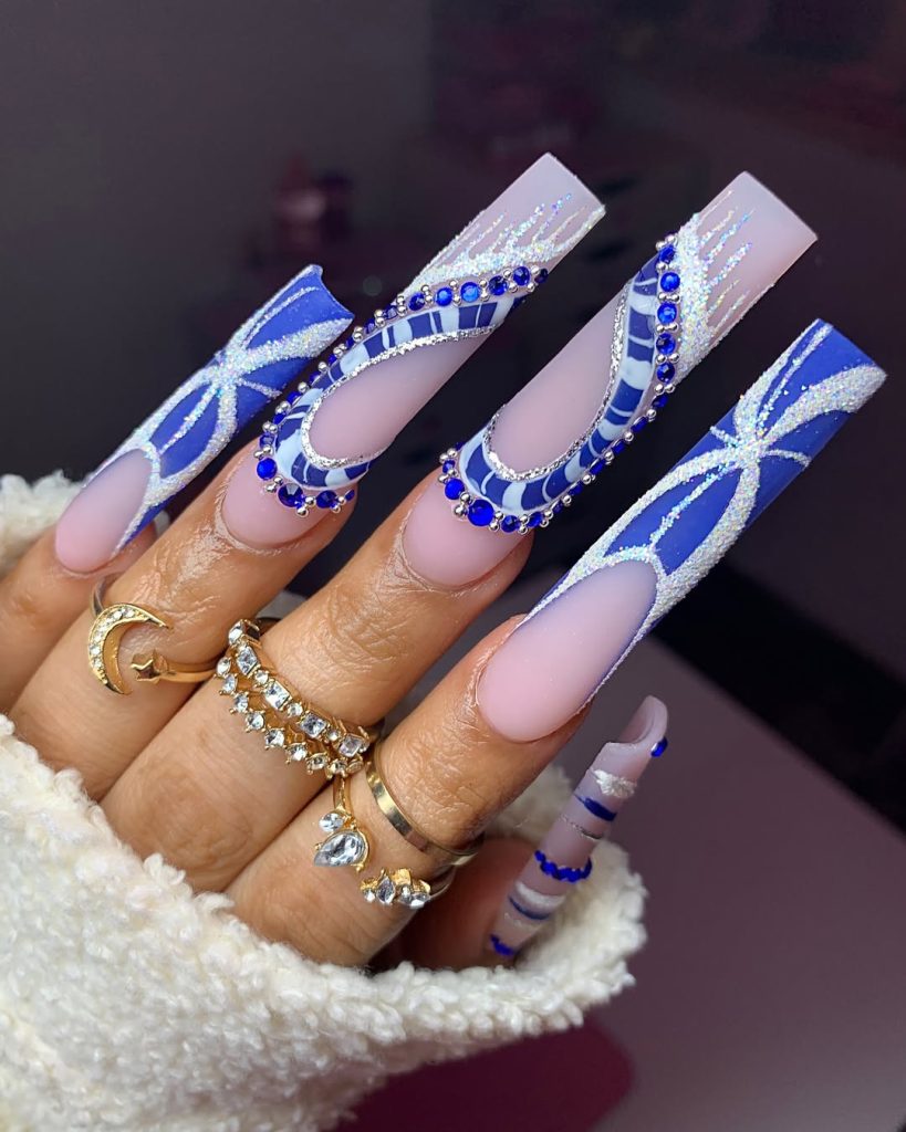 Statement Blue ribbons sweep across frosted panels, edged in micro glitter and studded with cobalt stones. The elongated square feels couture—perfect for gala nights or New Year’s.
