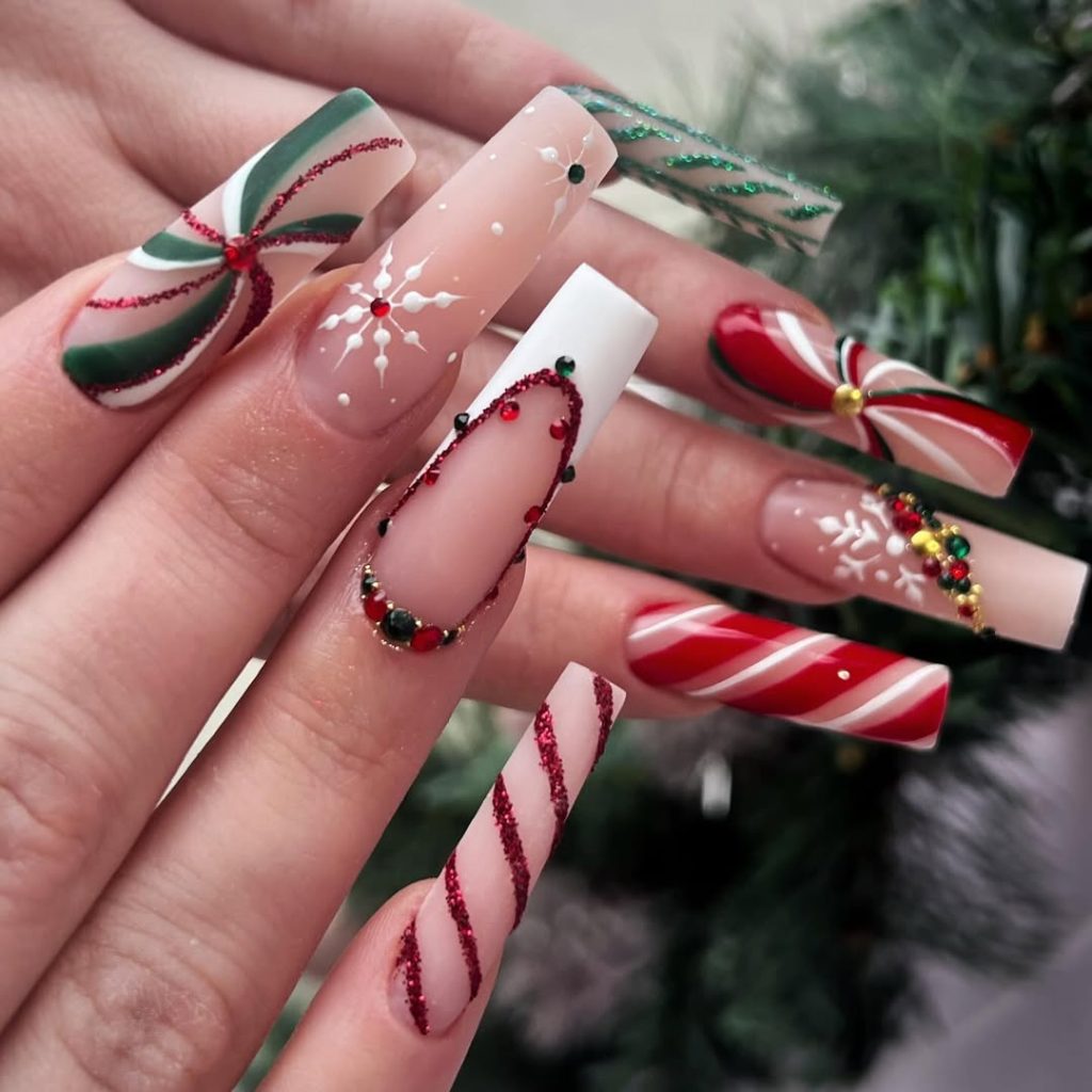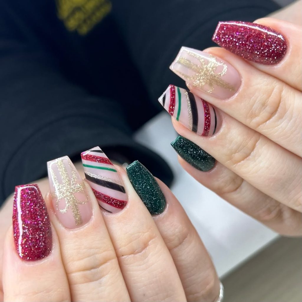 Slinky diagonal ribbons and present-bow accents mix deep Green, ruby Red, and sparkling Gold across Medium squares. A couple of full glitter nails turn up the party energy without overwhelming the hand.