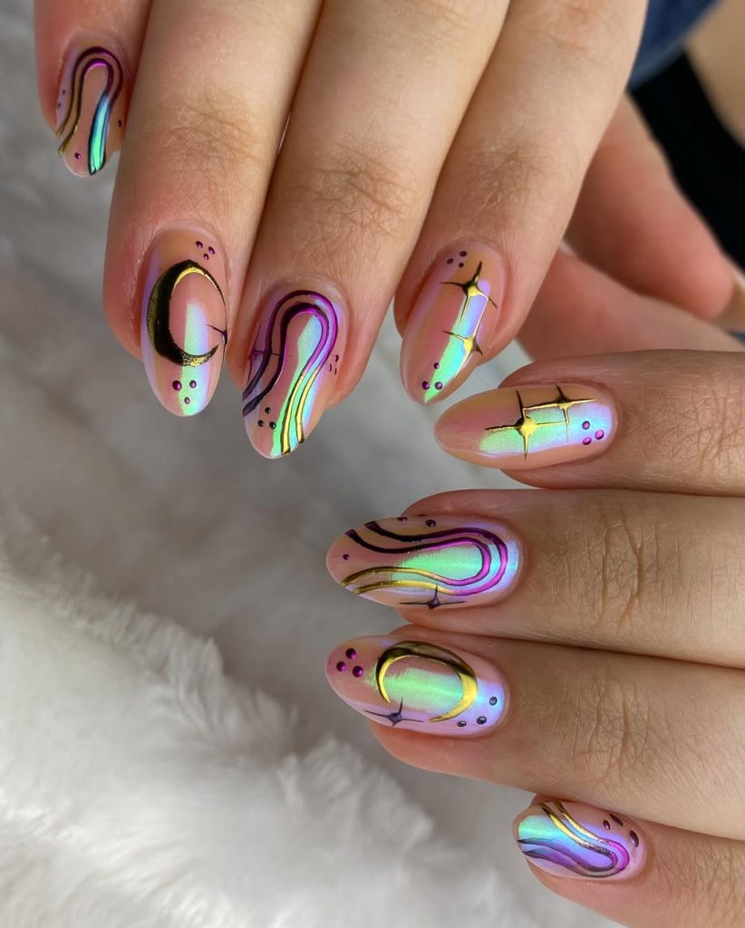 If you’re looking for something bold yet earthy, this short almond set combines shiny neutrals, sculpted gold texture and leafy green accents. The nails showcase different techniques, including three-dimensional embellishments along with metal foil and layered jellies, yet maintain harmony between them. This design works well with olive-colored linens, natural stone jewelry or a wide-brimmed hat for vacation chic with a twist.